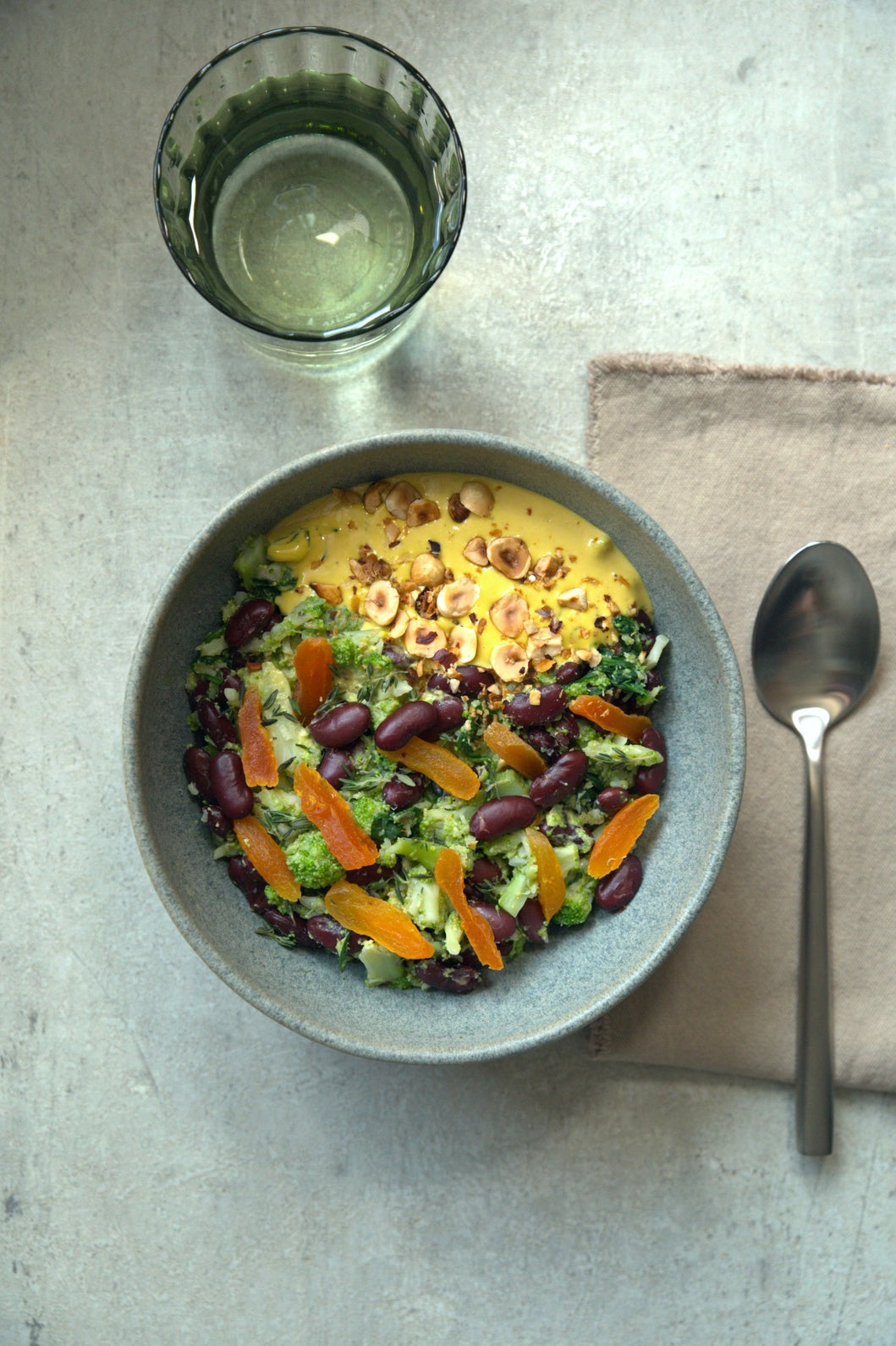 Tender red field beans, rich in plant protein and fiber, form the heart of this vibrant bowl, gently warmed with garlic and paired with crisp-tender broccoli. The apricot adds a sun-ripened sweetness that dances with the warmth of turmeric and the herbal lift of thyme.